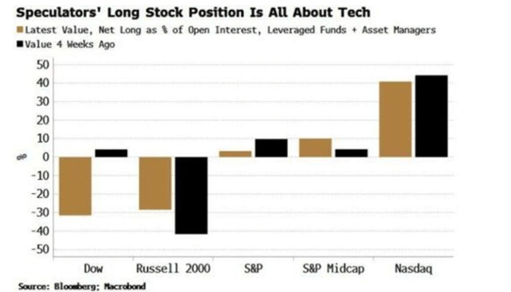 Aunque los principales índices siguen subiendo, la fuerza del mercado está muy concentrada: los futuros del Nasdaq muestran un posicionamiento excesivamente comprador, mientras que índices como el Dow Jones y el Russell 2000 siguen rezagados.