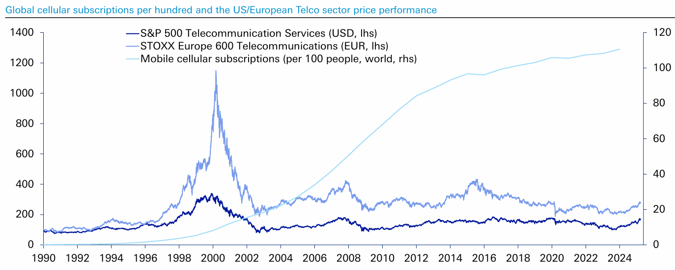 Una tecnología puede transformar el mundo (suscripciones móviles disparadas) mientras los inversores en las acciones del sector (índices de telecos) no recuperan sus máximos 25 años después. Un aviso crucial sobre la diferencia entre una revolución tecnológica y el retorno de la inversión.