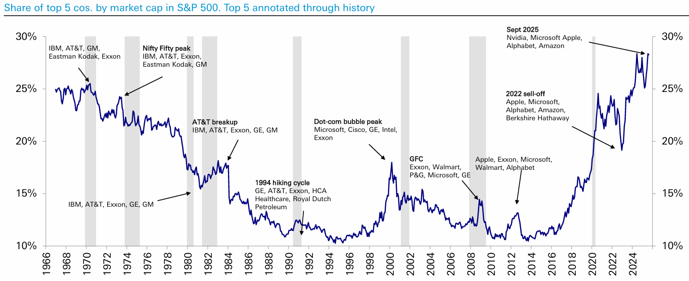 Valoraciones y concentración extremas en la renta variable de EE. UU., que amenazan con retornos muy pobres a largo plazo y evocan ecos de burbujas pasadas.
