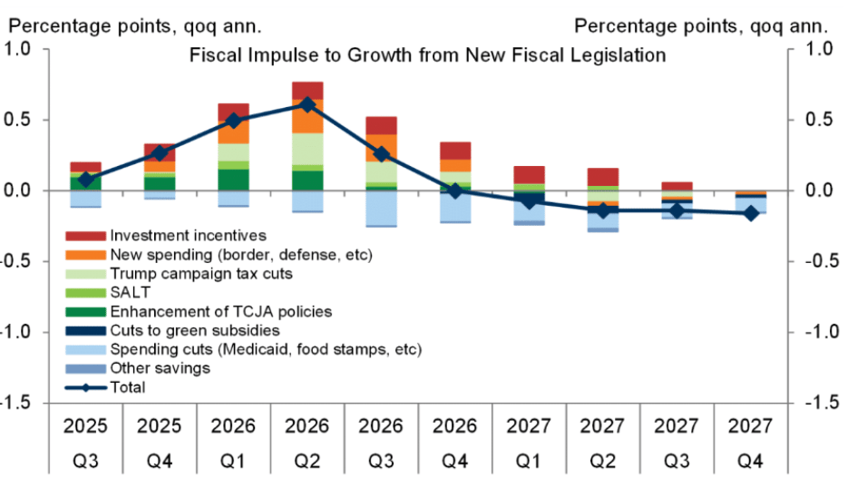 Se espera un fuerte impulso fiscal en 2026, pero que se diluya progresivamente hacia 2027, cuando los efectos netos podrían incluso volverse negativos por recortes en programas sociales y subsidios.