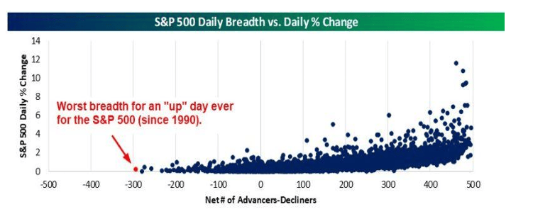 La amplitud no acompaña: vimos señales como Hindenburg Omen, un día alcista con la peor amplitud registrada y máximos con amplitud negativa. El S&P equiponderado vuelve a quedar atrás del cap-weighted...