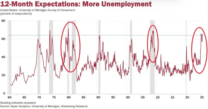 La Encuesta de Consumidores de la Universidad de Michigan muestra que el 64% de los estadounidenses espera que el desempleo aumente en los próximos 12 meses, un nivel no visto desde la crisis financiera.