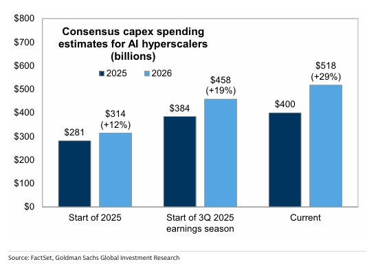 La clave del trimestre ha sido el capex de hiperescaladores en IA: el consenso para 2026 ha subido de $314bn a $518bn en lo que va de año. Traducción: la autopista de la IA se ensancha; puede presionar márgenes en el corto, pero amplía los carriles de crecimiento para 2026-27.