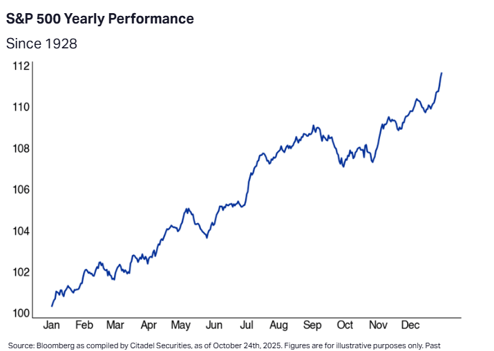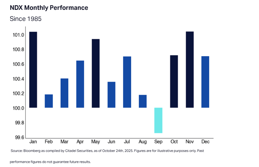 Estamos entrando en una fase estacionalmente favorable para los mercados (noviembre-diciembre), históricamente asociada con retornos positivos, especialmente en los últimos días del mes.