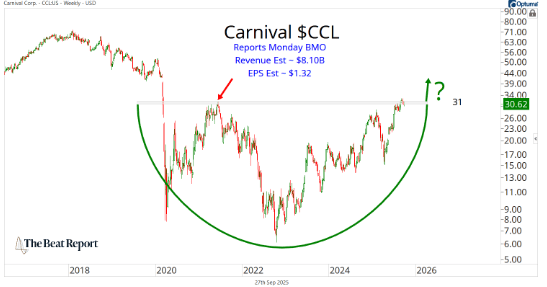 Su principal competidor, Royal Caribbean ($RCL), ya rompió máximos históricos, lo que deja a CCL como potencial rezagado a ponerse al día.